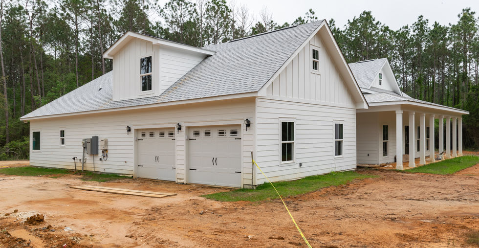 This modern farmhouse blends timeless charm with fresh, clean design. The bright white exterior is complemented by a spacious front porch with classic columns and elegant black double doors. A winding walkway leads through beautifully landscaped flower beds filled with colorful blooms, evergreens, and neatly mulched borders, all set against a lush green lawn. Surrounded by towering pines, this home offers both curb appeal and a welcoming, serene atmosphere—perfect for buyers seeking a blend of country charm and modern comfort.